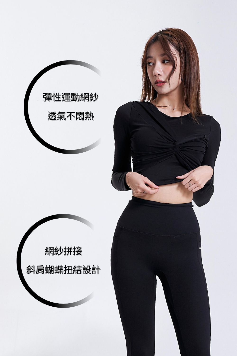 • 彈性運動布料搭配前方輕柔裸感網紗,滑順親膚,修身短版版型,透氣不悶熱,舒適感滿分。