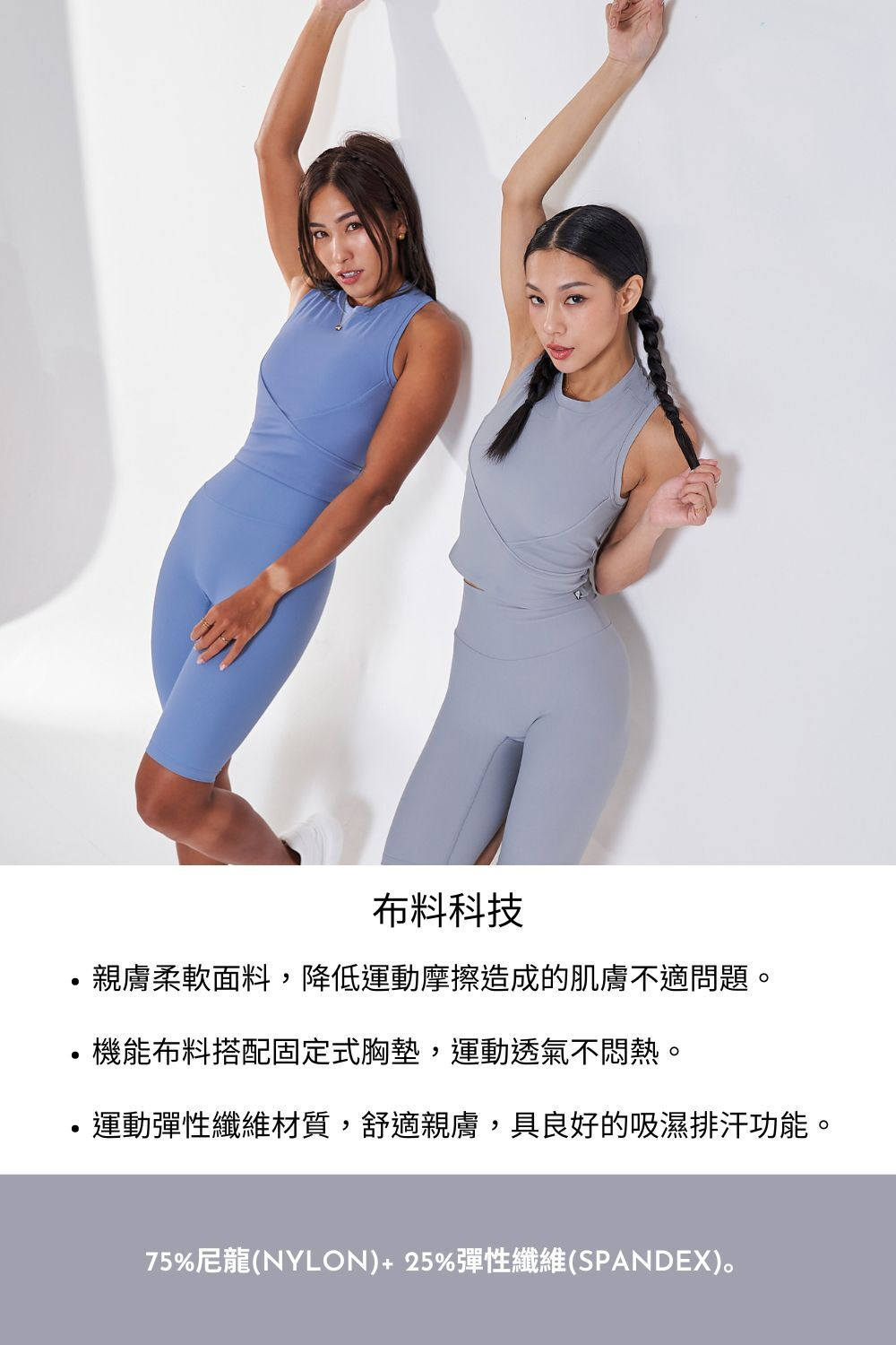 • 布料輕盈透氣、具彈性支撐力,布面質感細膩貼合更顯修長身形,運動或日常活動都能自在伸展。
