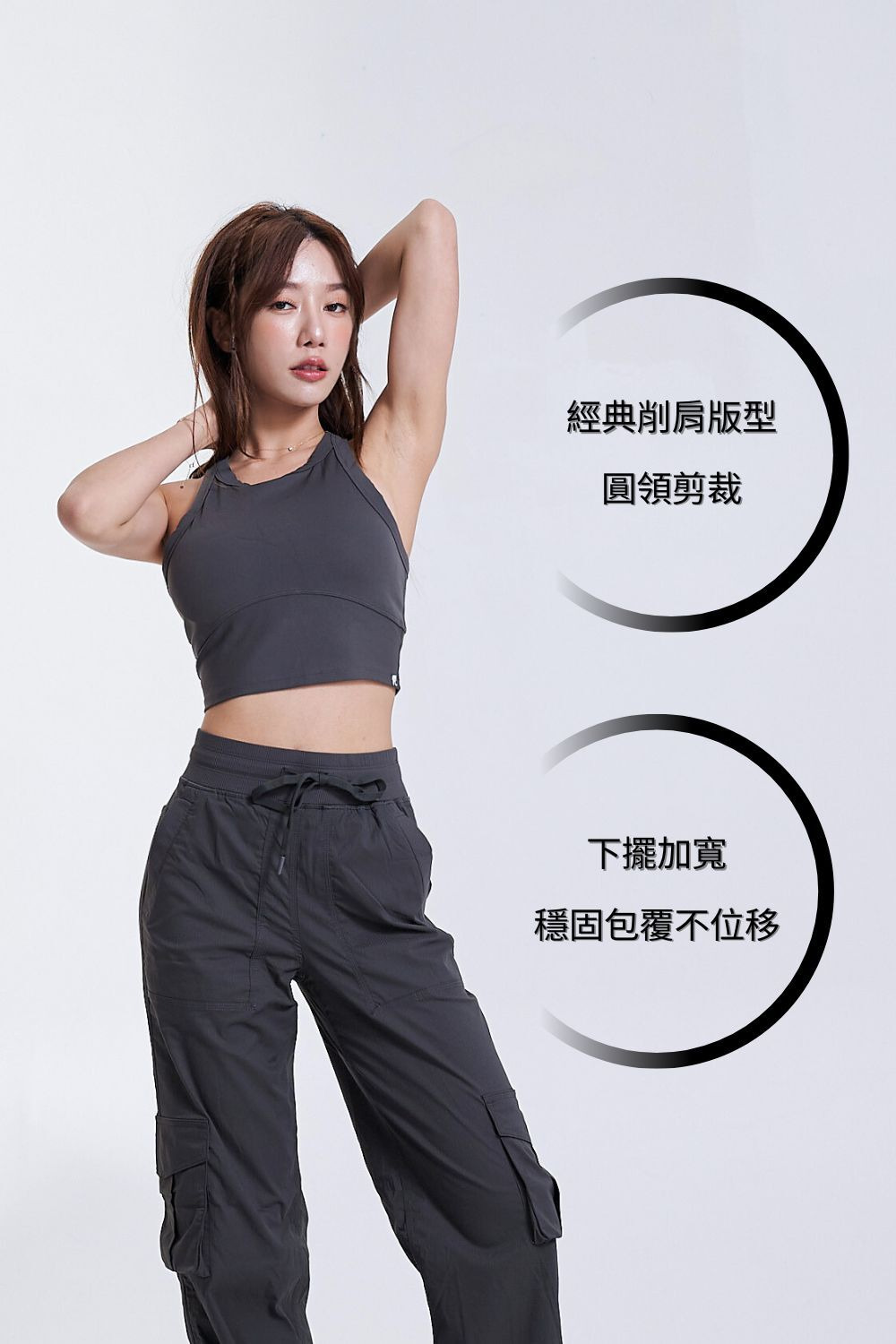• ✱本款採用柔軟運動布料,搭配貼合的領口版型,穿著時因布料自然拉伸,領口可能會出現輕微的波紋感。此為材質特性所致,非設計木耳邊也不為瑕疵,不影響外觀與穿著功能。如您對此較為在意,購買前還請留意。