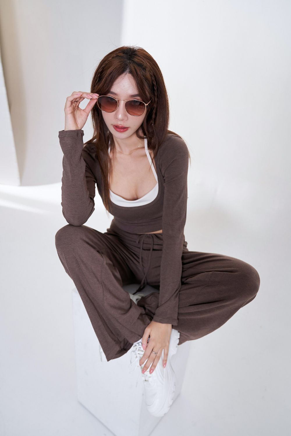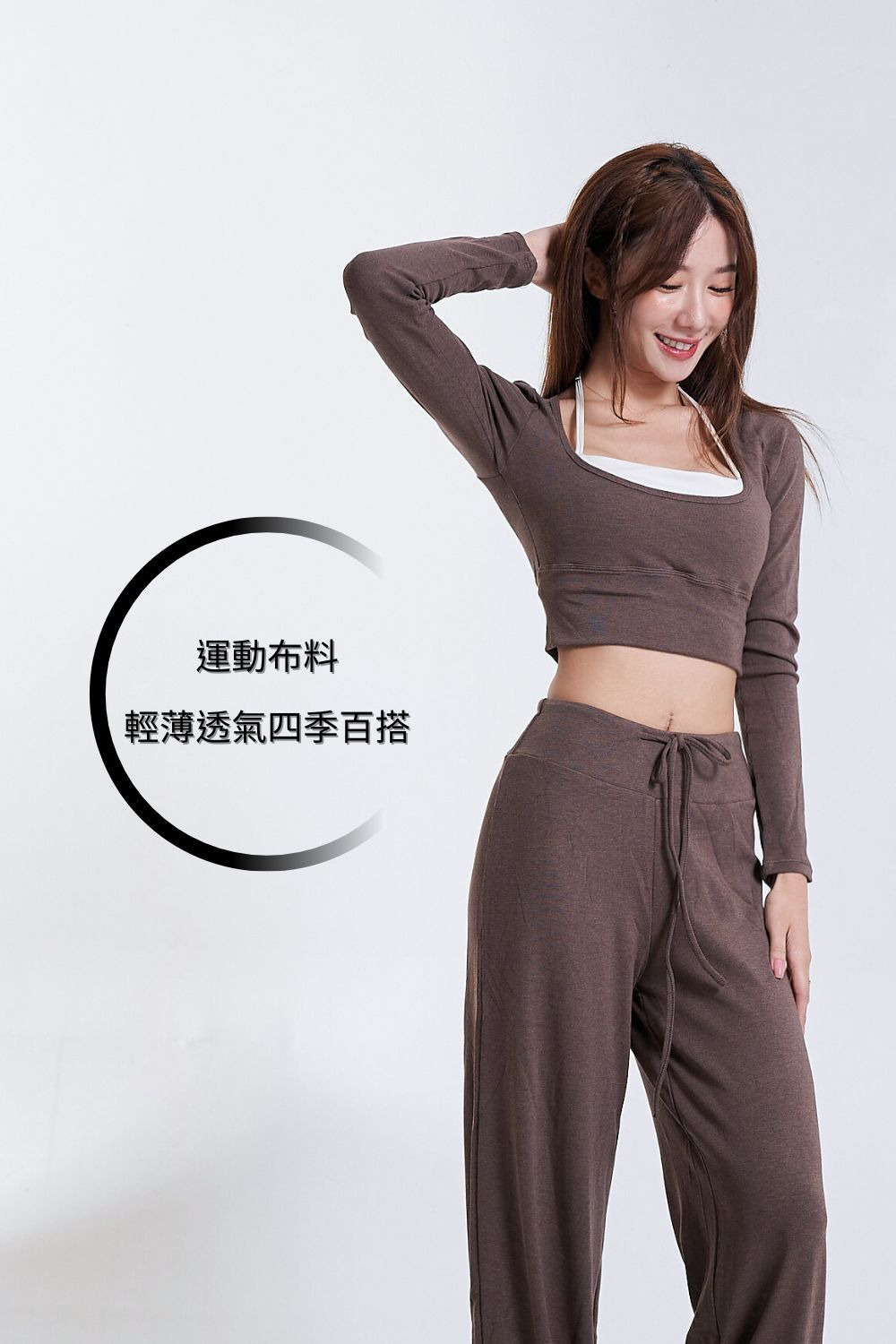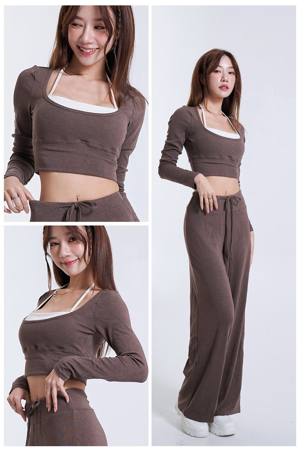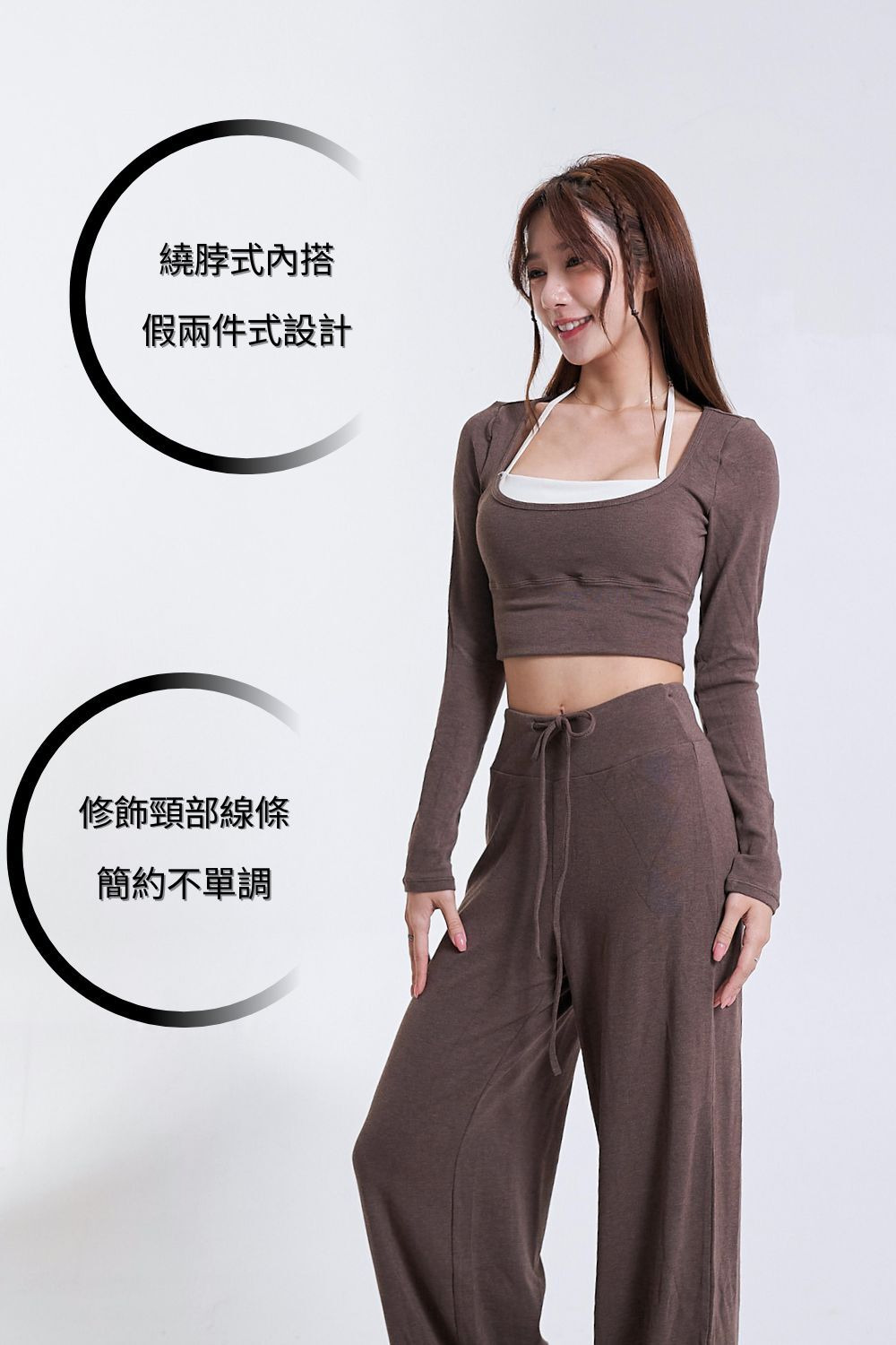 • 繞脖式內搭與外層長袖一體成型,假兩件式設計,簡單一件就能穿出層次感與小性感。