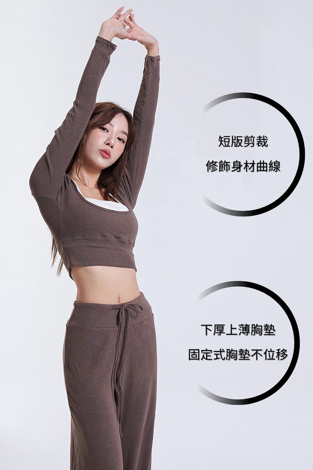 • 內附上薄下厚固定式罩杯,穩定包覆不易位移,運動時也能更自在安心。